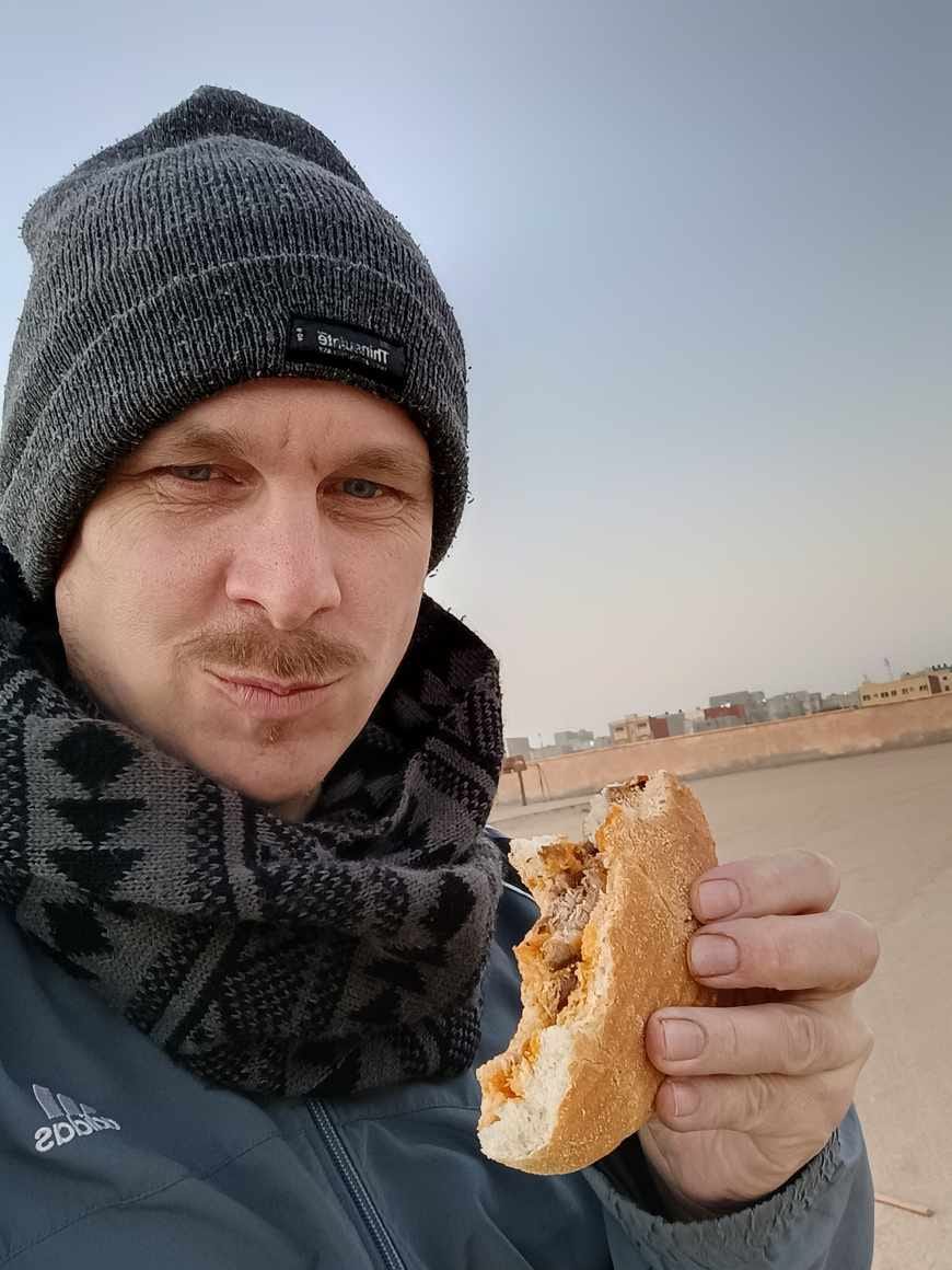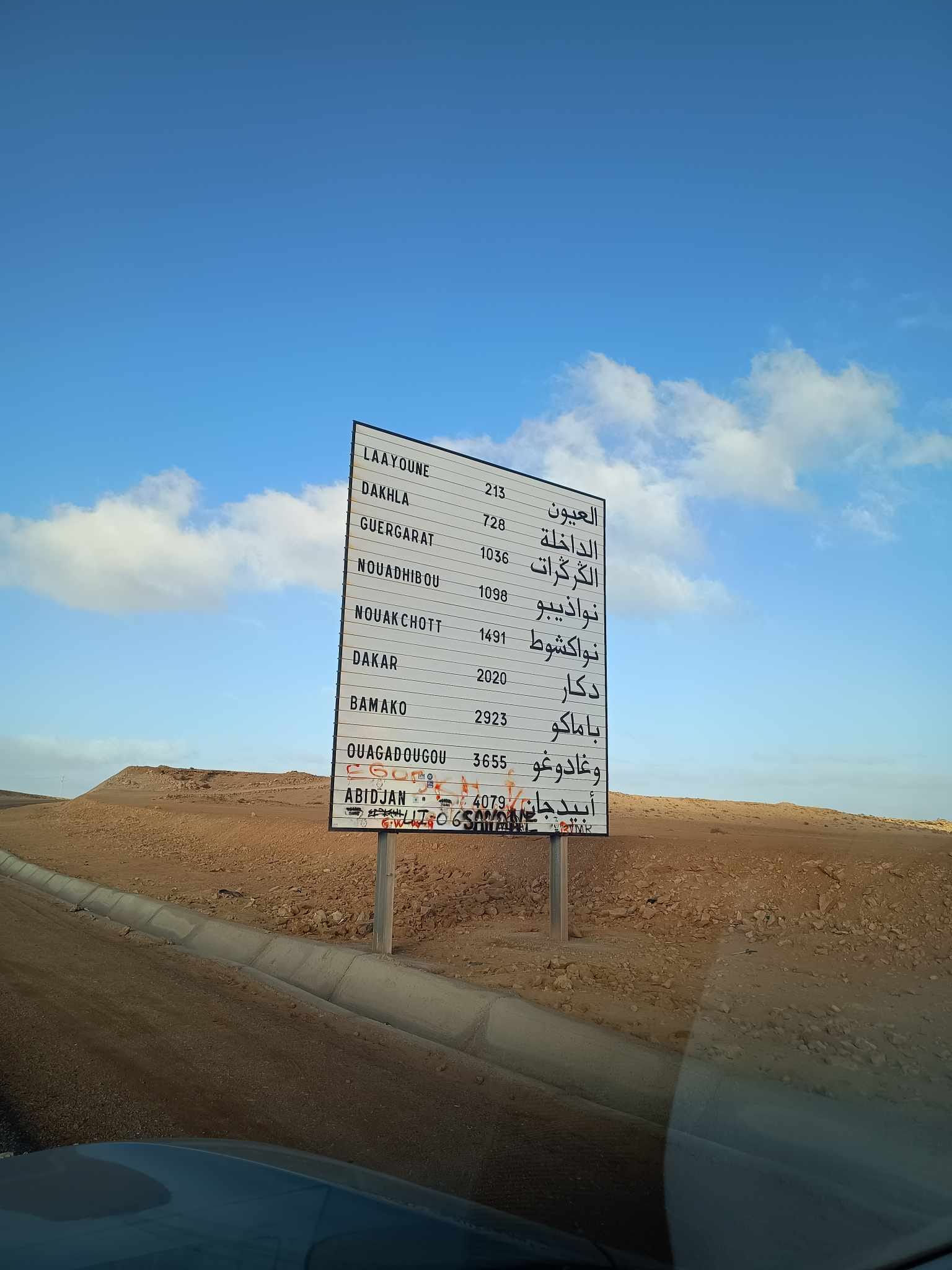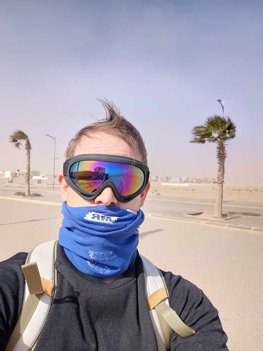 Ahora todo esto se ha convertido en normalidad. Conducir a 80 km por hora tiene ventajas. El carburante empieza a ser mucho más económico acercándome a Mauritania, unos 90 céntimos el litro, y las gasolineras aparecen con más distancia entre ellas. Por eso me he puesto quince litros extra en el bidón, porque no me haría gracia quedarme tirado en un entorno hostil para la vida, como uno se imagina el «Far West« un entorno que no invita a quedarse. Aun así, la gente aquí se queda, con insistencia, contra la arena y el viento constante, entre el ocre y la niebla.