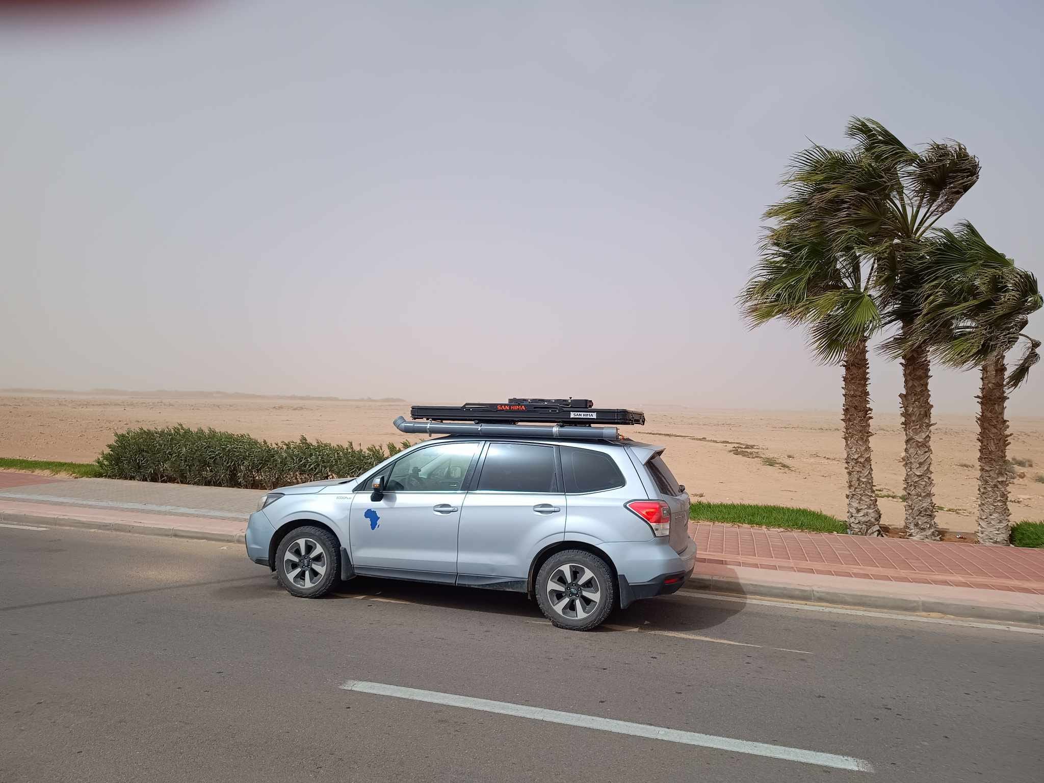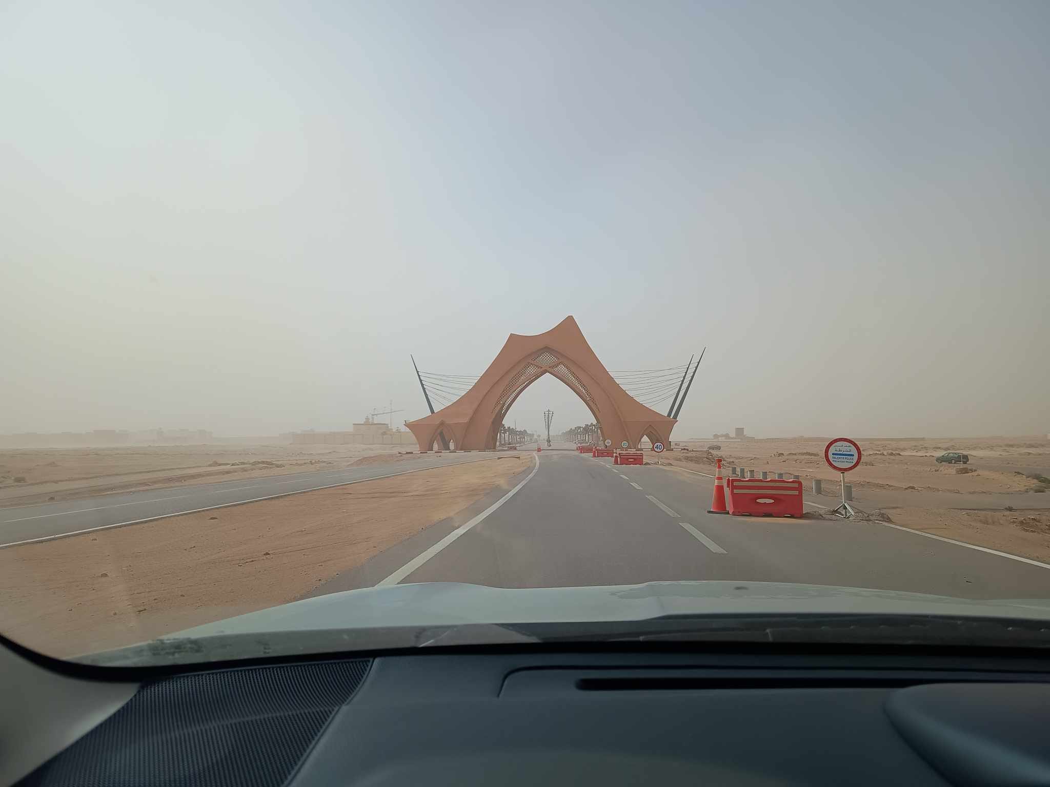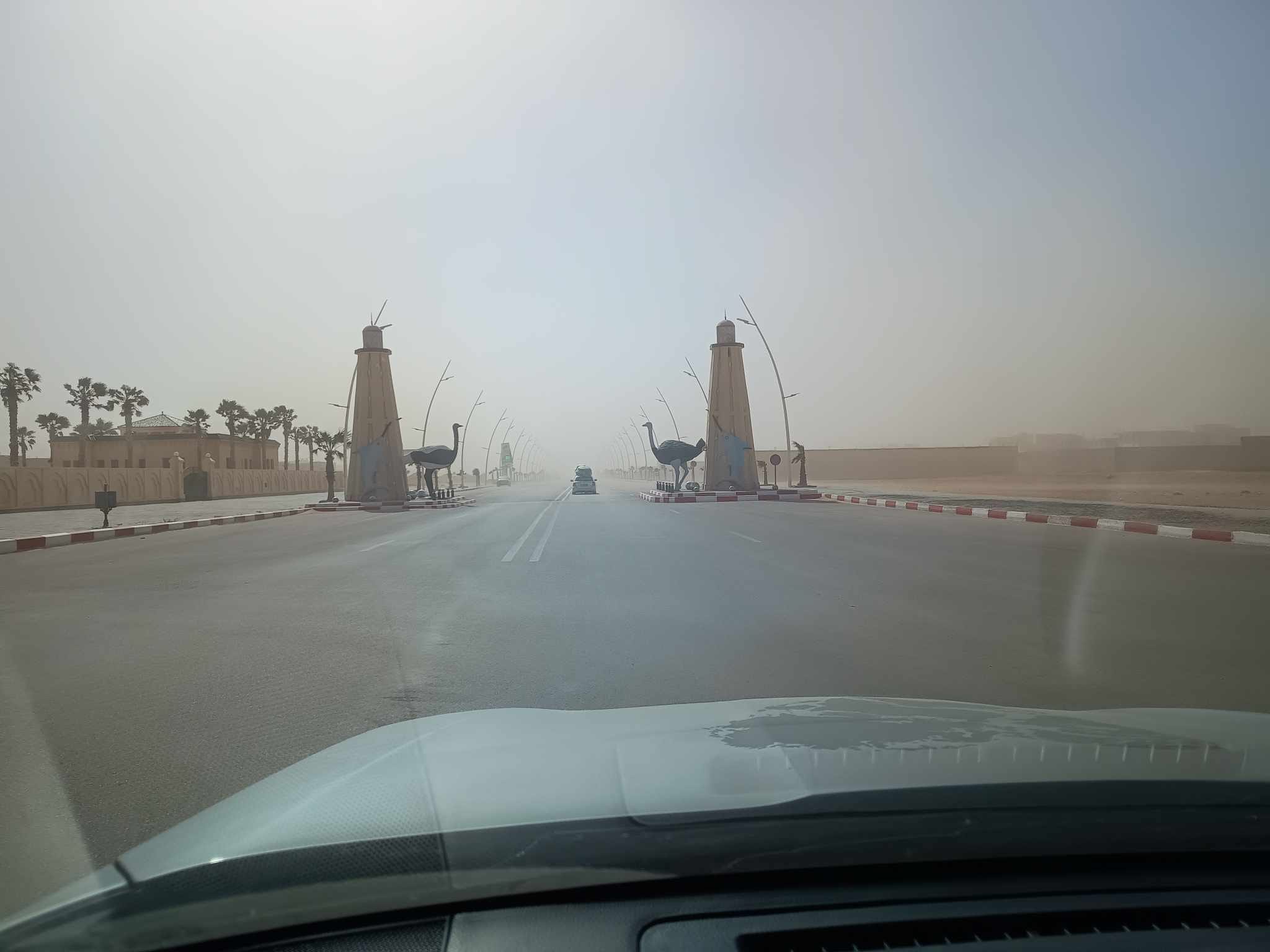 La niebla densa e incierta, como toda la expedición, la he conocido de varias maneras. Primero, en la parte norte, durante horas en forma de vapor. Después, a partir de Agadir, en forma de tormentas de arena constantes que parecían lluvias o pequeños granizos por el sonido que hacían en el coche. No dejan ver la superficie de la carretera, ( a veces la arena en el asfalto mezclado por el viento parecen espectros en movimiento si se mira demasiado tiempo ) , ni los vehículos a cincuenta metros.