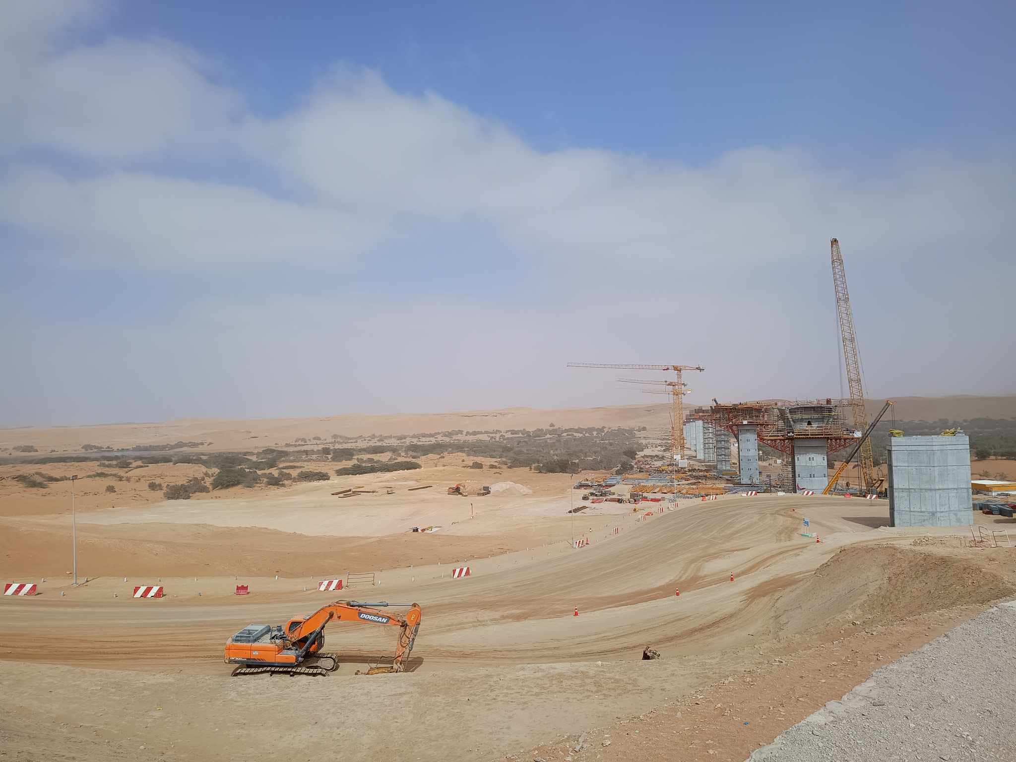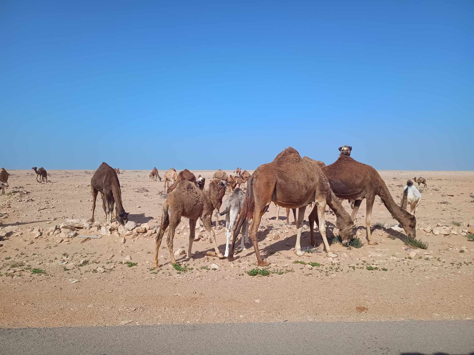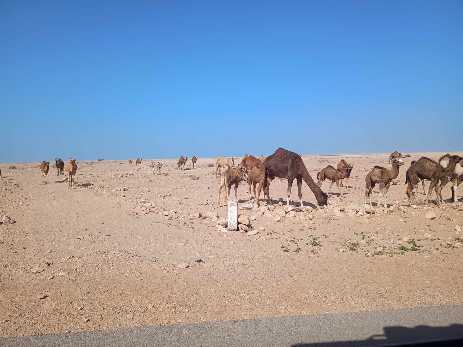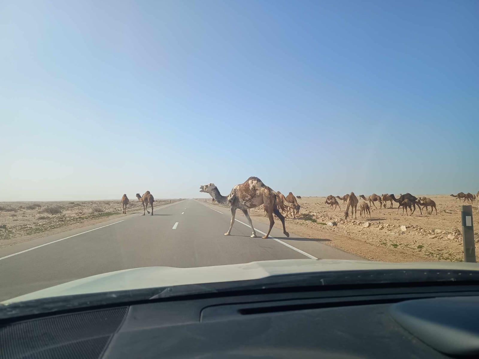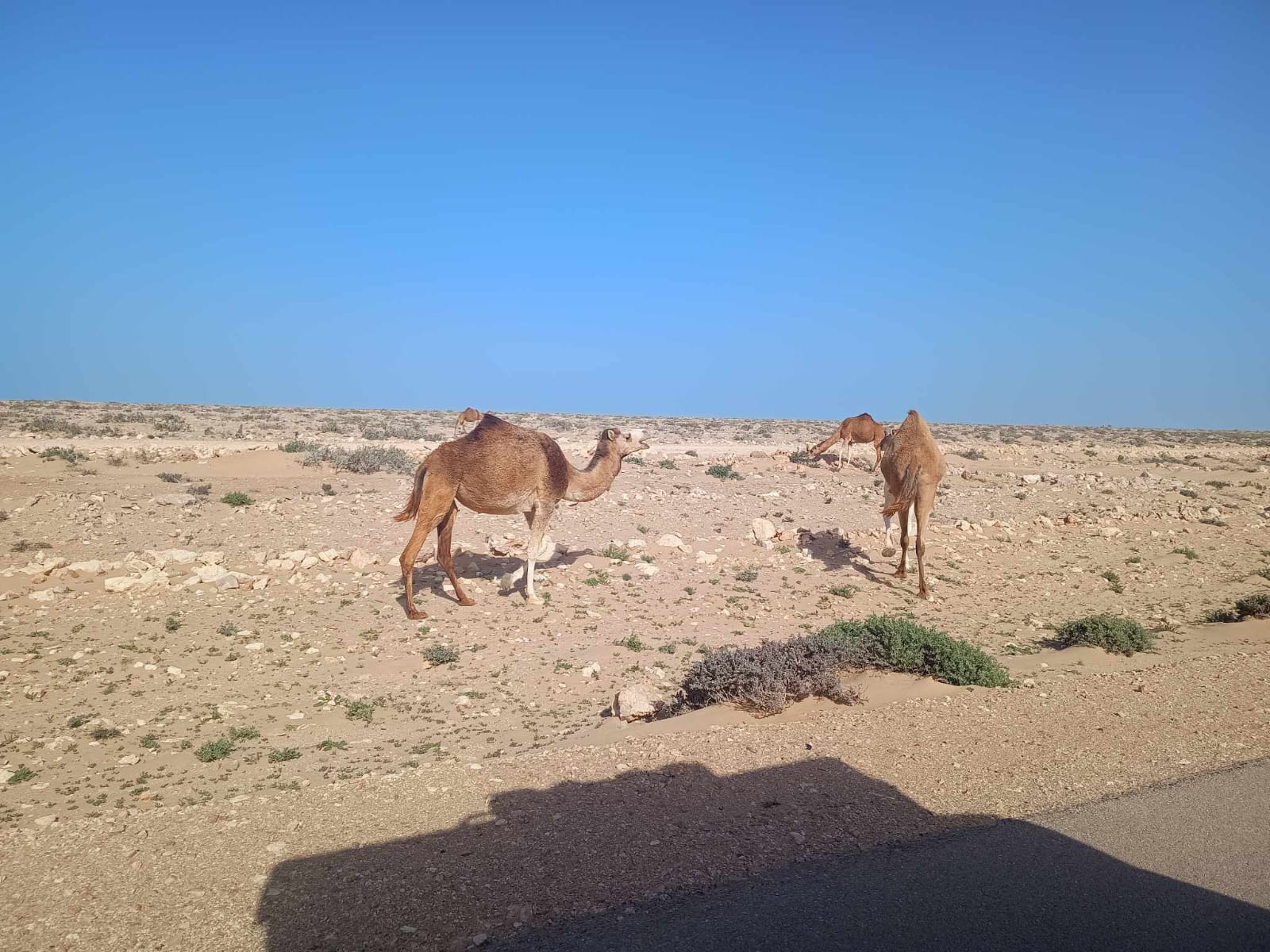 Y entre tramo y tramo, los dromedarios moviéndose por el desierto, tranquilos, como si el viento y la arena no fueran con ellos.